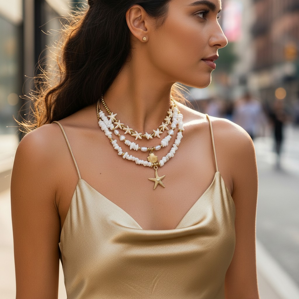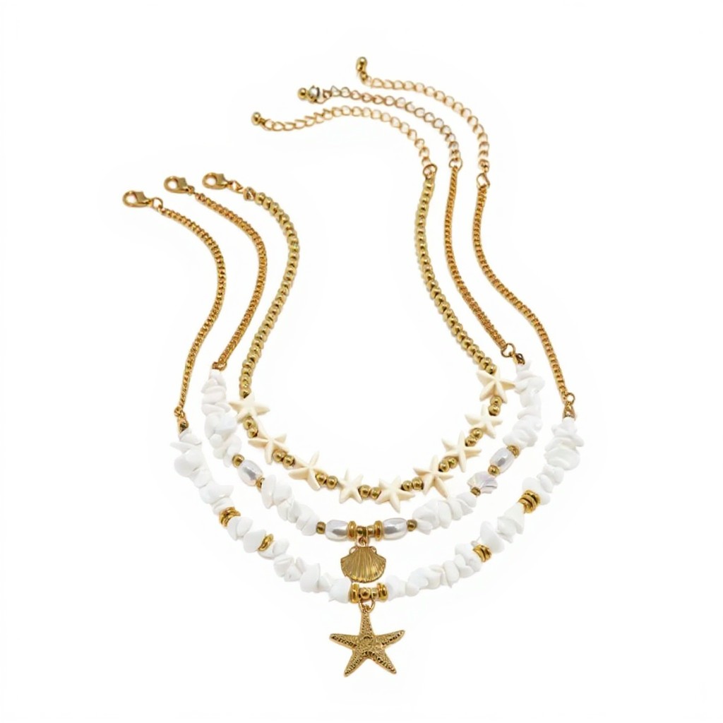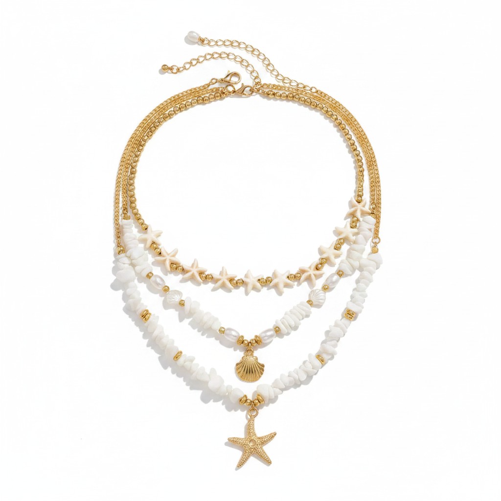 Efektowny naszyjnik - trzy łańcuszki w złotym wydaniu – najkrótszy w delikatne ecru gwiazdki i złote koraliki, środkowy w białe kamyczki i i perełki z zawieszką muszelką oraz najdłuższy z kamyczkami przekładanymi złotymi koralikami z zawieszką gwiazdką.