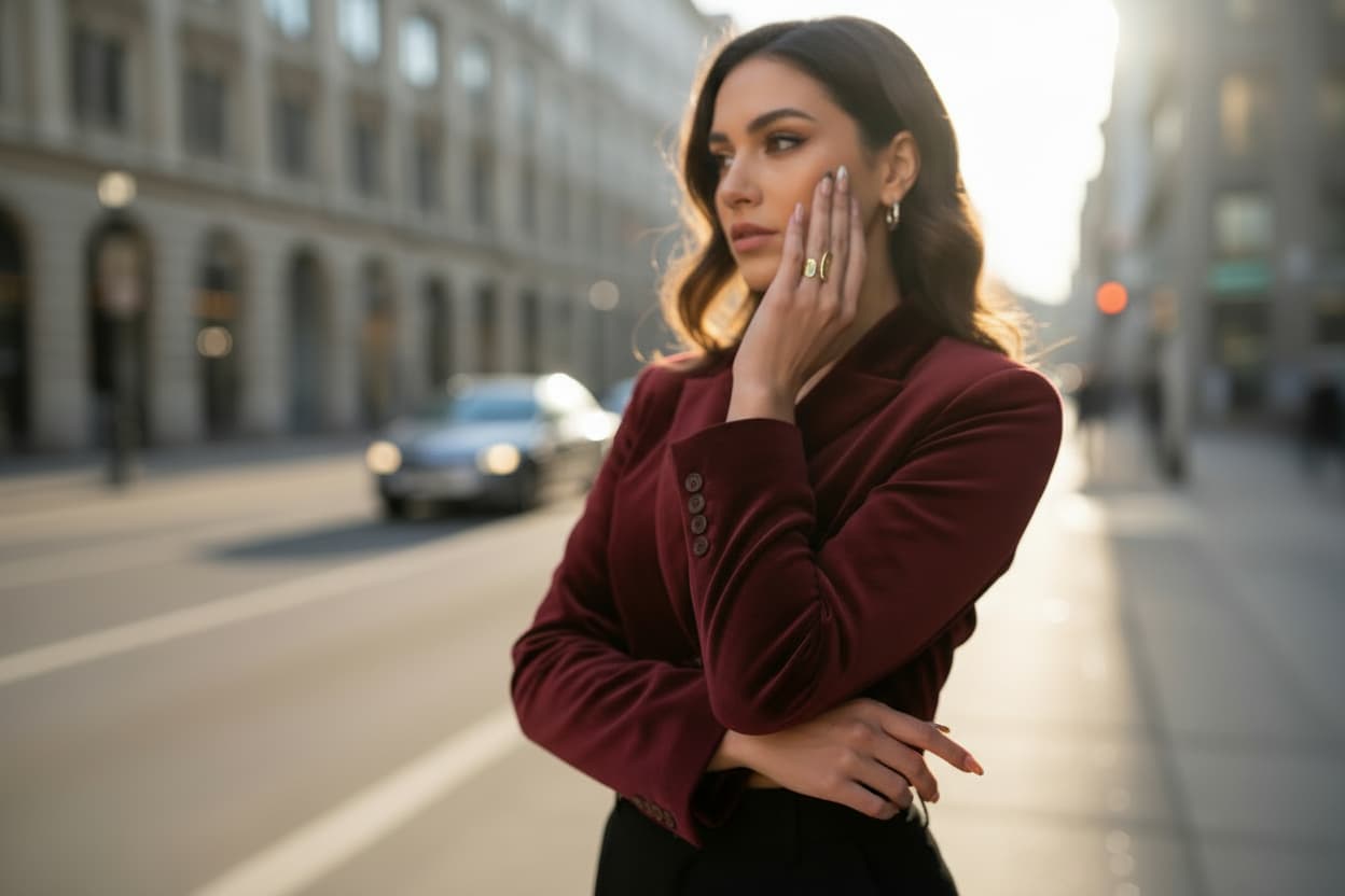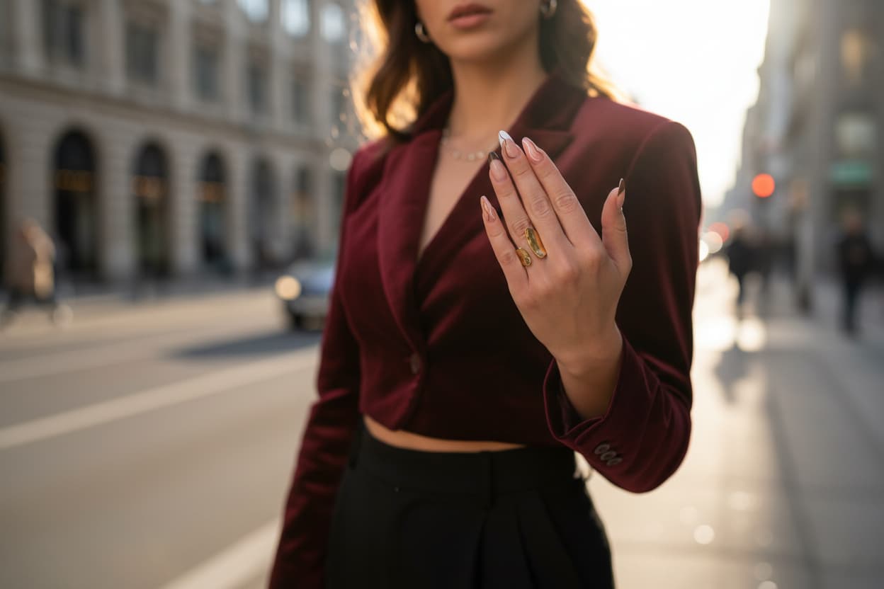 Noś go solo na palcu dla ultra-minimalnego efektu, który krzyczy luksus, albo stackuj z prostymi pierścionkami, by zbudować warstwowy, miejski vibe. Idealnie łączy się z burgundowymi marynarkami, ale jeśli takiej nie masz – noś do swetra z jeansami czy satynowej spódnicy z ecru koszulą.