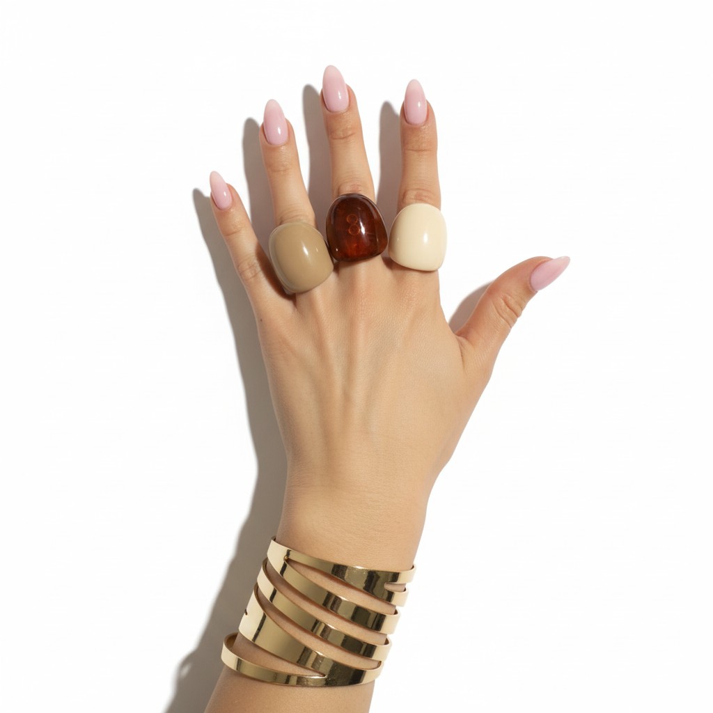 Odkryj Trio Jelly: ekskluzywne pierścionki w hitowych odcieniach ecru (jak delikatna pościel), latte (jak poranna kawa) i bursztynowym (jak zachód słońca). ✨